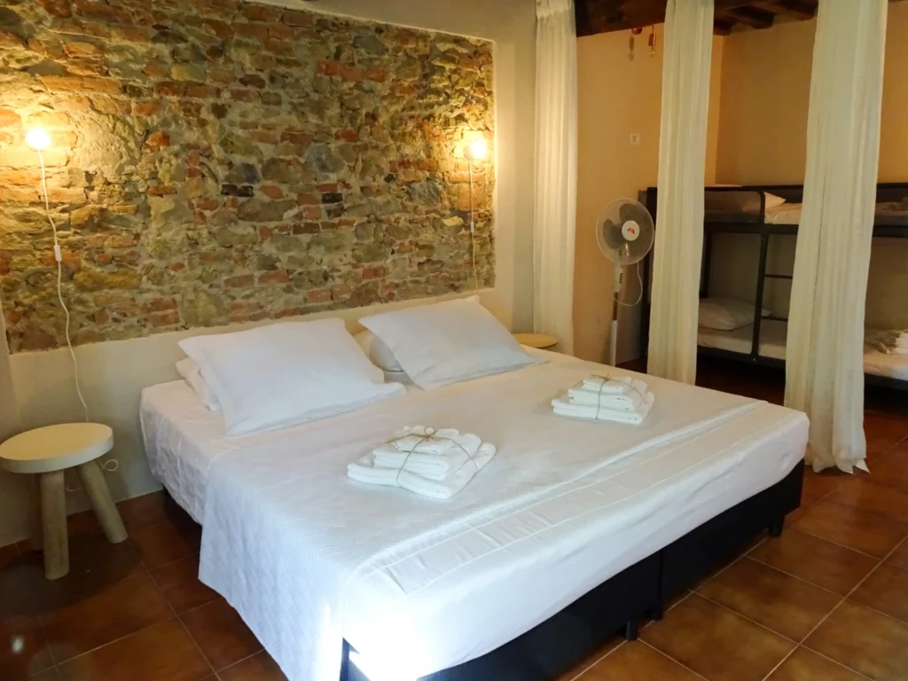 - Comfortabele boxspringbedden met topper, ventilatoren en horren. Geen airco, maar de dikke muren houden het binnen koel in de zomer.
